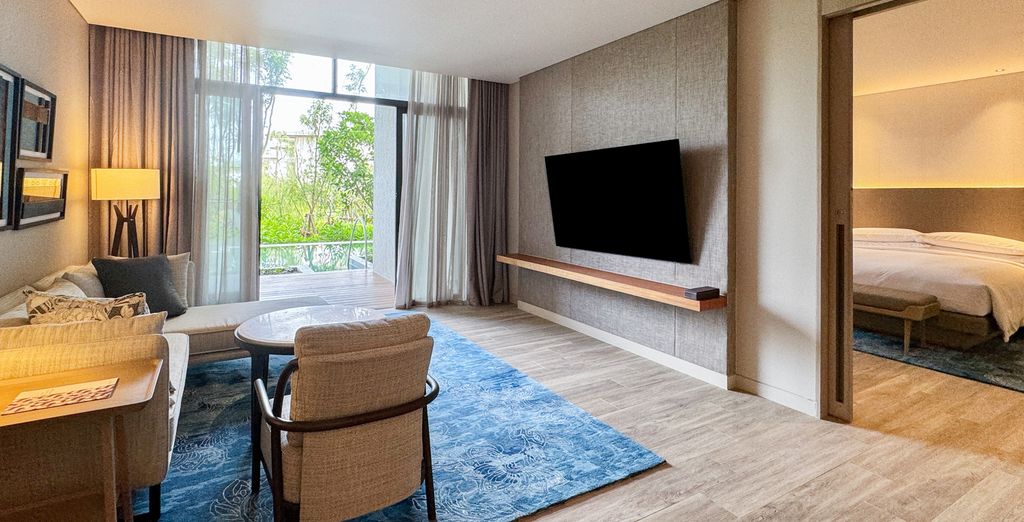 Rilassatevi nella pace e nella tranquillità della camera Deluxe con accesso alla piscina, per una vacanza all'insegna del comfort.