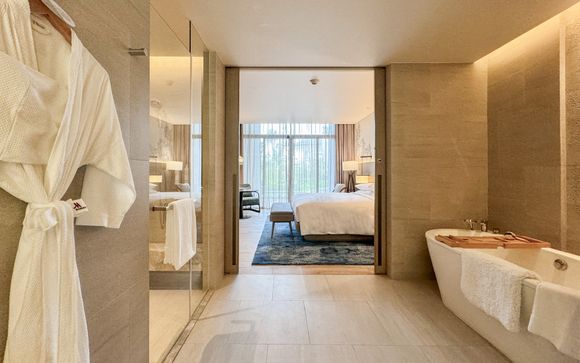 Aprite la porta della vostra camera Deluxe vista oceano e godetevi il comfort moderno e l'arredamento elegante. Quando il sole tramonta, uscite sul balcone e ammirate la vista sul mare di fronte a voi.