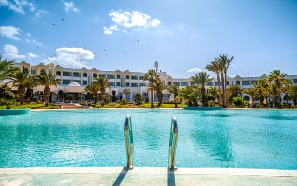 L'Hotel Palace Royal Garden 5* sorge al centro di un grande giardino di 14 ettari affacciato sul mare e sul golf di Gerba. È costruito a forma di mezza luna, a soli 200 metri dalla spiaggia e dalle acque turchesi del Mediterraneo. Le sue strutture moderne e lussuose vi faranno vivere una vacanza meravigliosa.