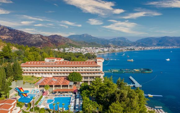 Situato sulla pittoresca costa del Mar Egeo, nel cuore del mondo della vela, l'hotel All-Inclusive Labranda Mares Marmaris 5* è circondato da una pineta e inondato di sole. L'hotel vanta opzioni di ristorazione di alta qualità e la vicinanza a villaggi incantevoli. Godetevi il profumo dei pini e del mare dalla spiaggia di 650 metri, che si estende lungo la baia di Marmaris, o approfittate dei lussuosi saloni e terrazze dell'hotel.