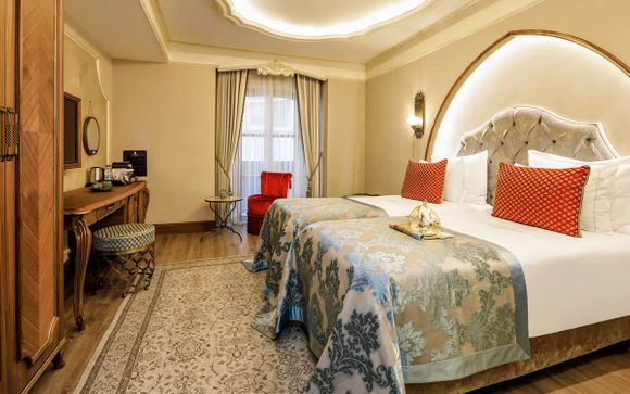 Soggiornate in questa camera Deluxe, che offre un'esperienza unica nel cuore del quartiere storico, combinando comfort, eleganza e un sonno ristoratore in un ambiente accuratamente decorato. Ogni camera è decorata con una camicia talismanica che rappresenta una replica artigianale degli abiti del sultano del XVI secolo, integrata nell'elegante arredamento ottomano dell'hotel. Le camicie, considerate portatrici di vittoria, sono accompagnate da miniature in ceramica raffiguranti i monumenti talismanici di Istanbul.