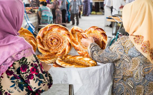 Fate il pieno di vitamine appena svegli con la prima colazione. Per il resto dei pasti, avrete la libertà di esplorare le varie specialità locali. Scoprite il delizioso plov uzbeko, il gustoso kebab shashlik e il tradizionale pane croccante , assaporando gli aromi e i sapori unici dei mercati e dei ristoranti locali. Per un comfort ancora maggiore, optate per l'opzione di mezza pensione (bevande escluse), disponibile a un costo aggiuntivo, e godetevi le colazioni negli hotel e i pranzi in ristoranti locali accuratamente selezionati, dove potrete assaporare le gustose specialità locali.